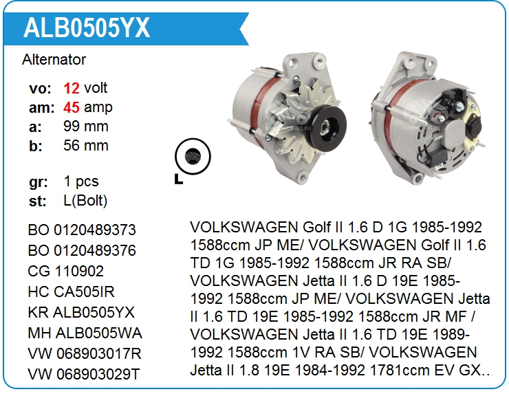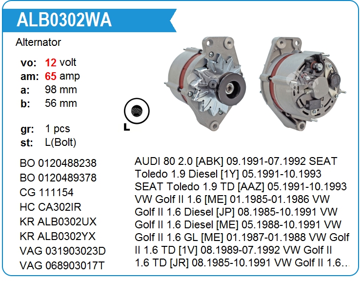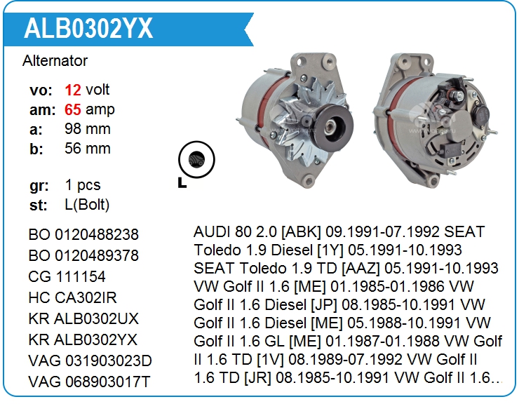 | Motorherz | ALB0302WA | Alternator | MSK | 1 | on stock | 200,89 EUR | |