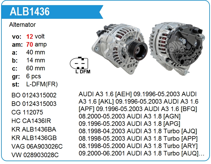 | Motorherz | ALB1436WA | Alternator | MSK | 1 | on stock | 195,68 EUR | |