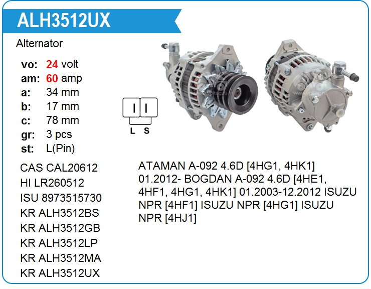 | KRAUF | ALH3512LP | Alternator | MSK | 1 | on stock | 240,94 EUR | |