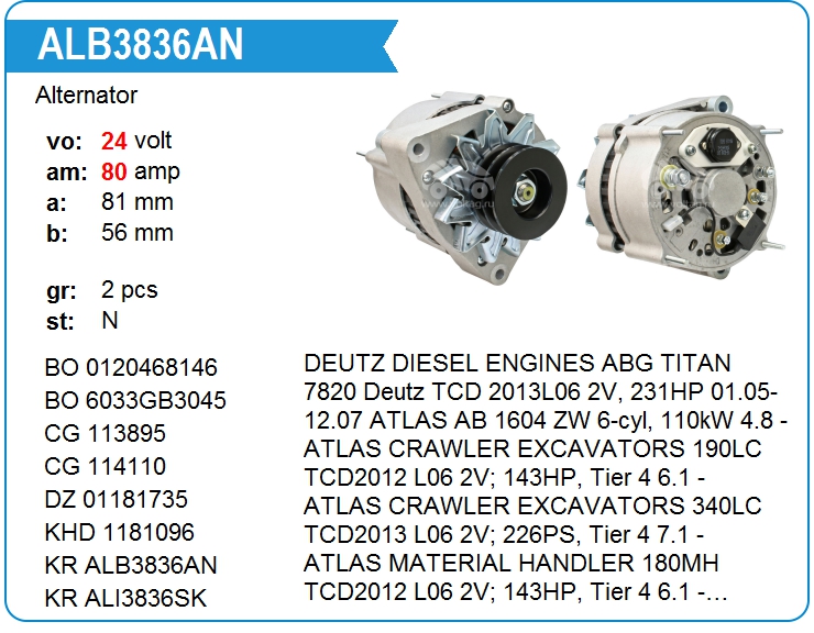 | KRAUF | ALB3836AN | Alternator with pulley 2 grooves | MSK | 1 | on stock | 221,66 EUR | |